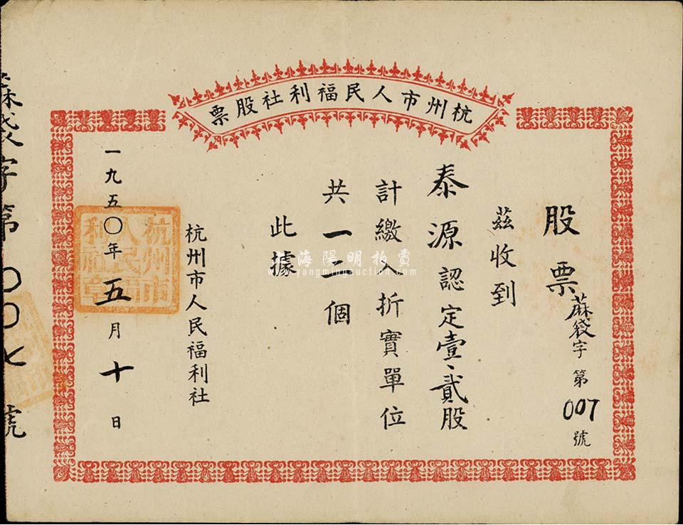 1950年杭州市人民福利社股票,此乃新中国建国初期之蔴袋折实股票,壹贰股计折实单位12个,其发行号码为第007号,形式较为特殊,八五成新