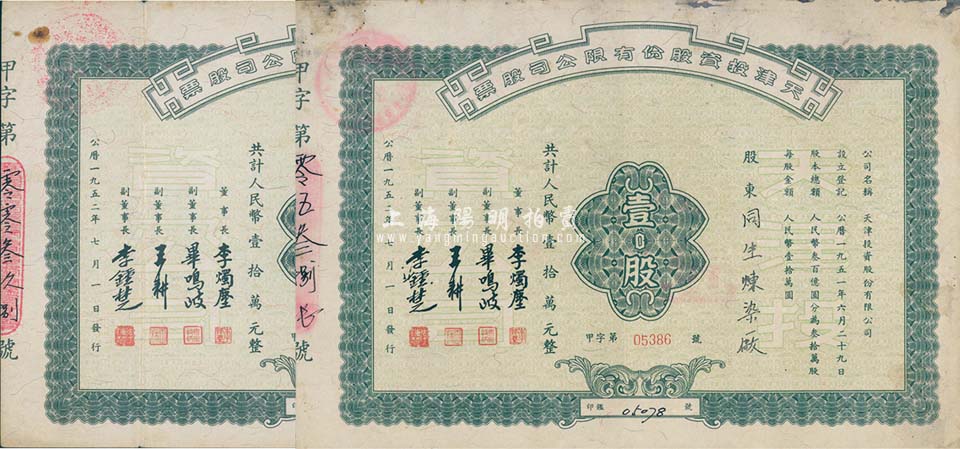 1952年天津投资股份有限公司股票共2枚,均为壹股计人民币壹拾万元,票上董事长李烛尘氏乃民主建国会发起人之一、新中国第一任轻工业部部长,副董事长李钟楚氏曾任民国交通银行总经理,八成新
