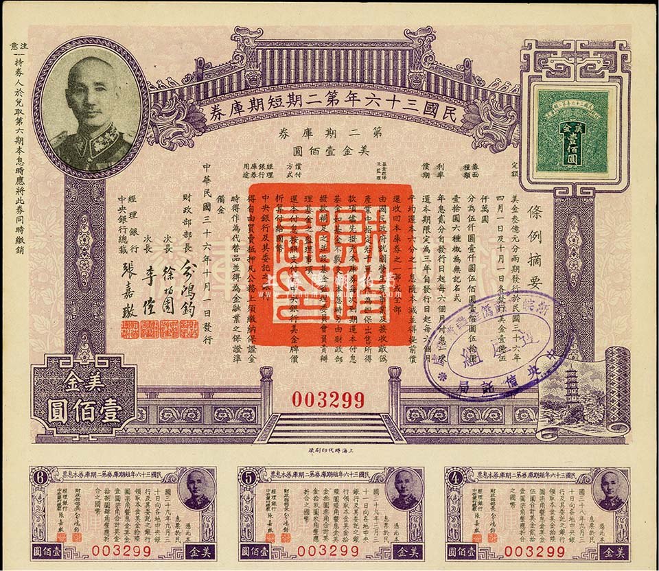 民国三十六年第二期短期库券美金壹佰圆,上印蒋介石肖像,八五成新