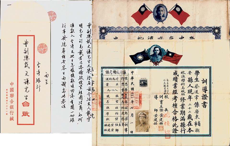 民国证书等5件,详分:1942年广东省立汕尾水产职业学校训导证书1张;1960年香港文德中学毕业证书1张;1934年收条1张,贴有广东税票;1972年香港警务处处长薛畿辅信函1则;1983年中国联合银行副理蔡传发致台湾银行副总裁曾文谦信函1则,附带有信封;保存尚佳,敬请预览