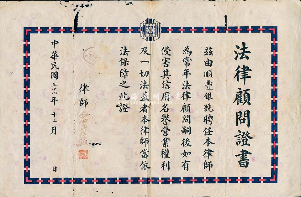 民国三十四年(1945年)老上海“法律顾问证书”1张,由律师俞钟骆氏(法学界著名学者,曾参与新中国宪法的制订)颁给顺丰银号,少见,六五成新