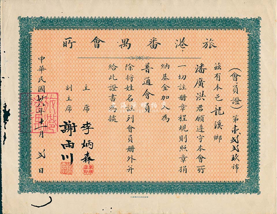 民国卅八年(1949年)旅港番禺会所·会员证1张,发给普通会员潘广洪氏,由主席李炳森、副主席谢雨川签署,有蛀孔,七五成新