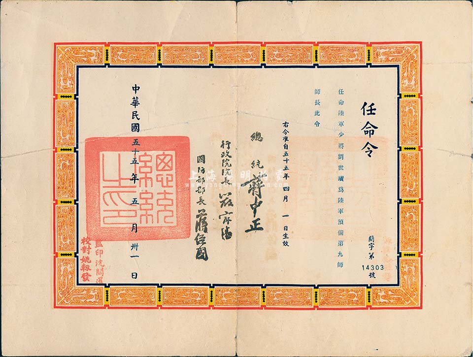 1966年“任命令”一张,任命陆军少将刘世璜为陆军预备第九师师长,由总统蒋中正、行政院院长严家滏、国防部部长蒋经国签署,七五成新
