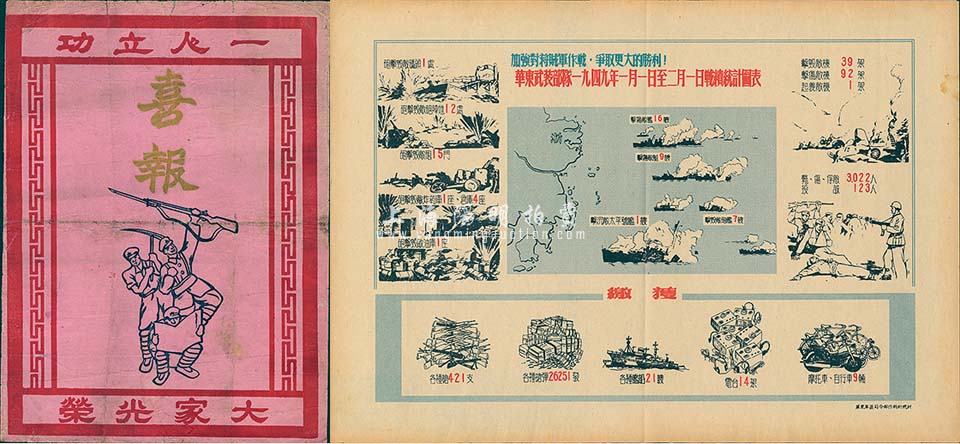 革命胜利文献2件,详分:1949年宋见学同志参加上海战役立功“喜报”1张,由中国人民解放军第三野战军第十兵团司令叶飞、政委韦国清等签署;华东武装部队1949年1月1日至2月1日战绩统计图表1张,上有“加强对蒋贼军作战·争取更大的胜利”字样;保存尚佳,敬请预览