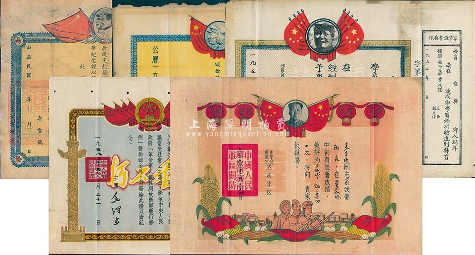 革命证书5件,详分:1949年皖北人民行政公署“革命牺牲烈士光荣纪念证”;1953年山东军区国防建筑工程第一工区指挥部颁发“二等模范”奖状;1953年崞县人民政府扫除文盲委员会颁发“毕业证书”;1958年革命牺牲军人家属光荣纪念证,由主席毛泽东签署;1959年中国人民解放军济南军区颁发“五好战士”三等功喜报;保存尚佳,敬请预览
