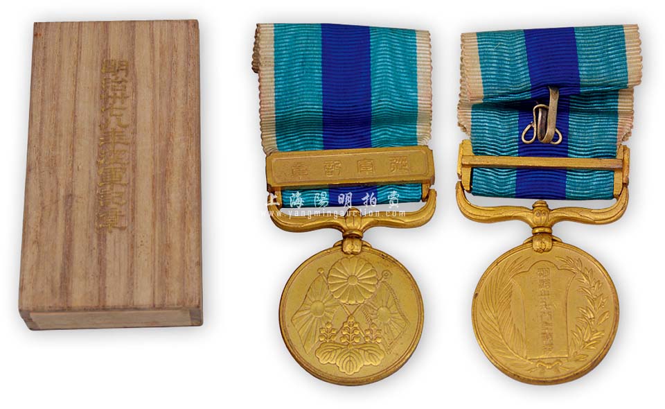 (1904-05年)“明治卅七八年从军记章”铜质镀金奖章1枚,正面为日本陆军、海军军旗交叉图;该奖章为日俄战争胜利而发行,乃日本侵华之历史罪证,附带有原装木盒,保存甚佳,敬请预览