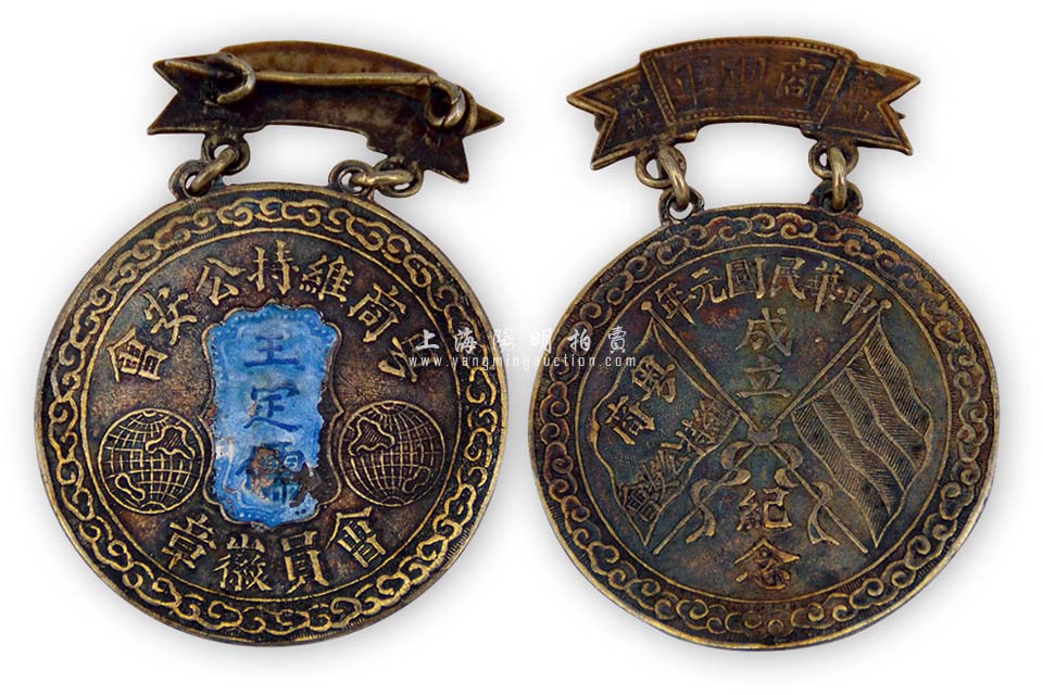 民国元年(1912年)成立“商团军·粤商维持公安会”银质会员徽章1枚,佩戴人为王定儒氏,此章为中华民国元年成立纪念,由董坤记造,保存甚佳,敬请预览