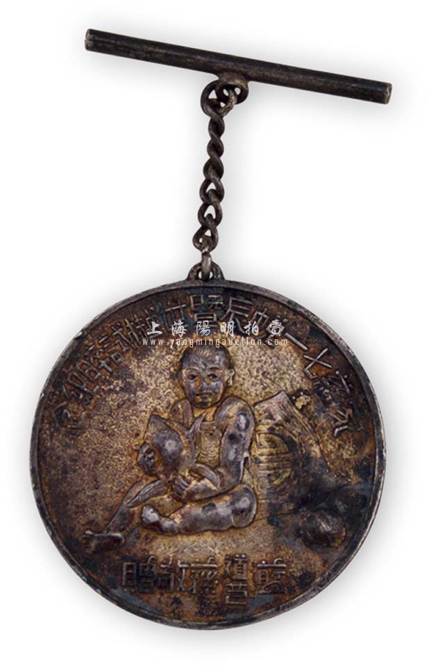 民国时期“蓝道荪、蓝岂荪敬赠·家慈七一帨辰暨世樾试晬纪念”银质纪念章1枚,背有“老宝庆”款;此蓝氏兄弟乃上海青帮大佬,曾三鑫公司(贩卖鸦片)负责人;保存甚佳,敬请预览
