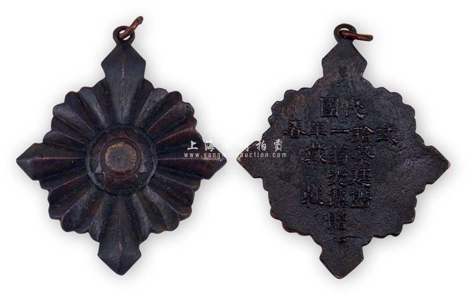 “十九路军淞沪抗日纪念”章1枚,正中为党徽图,背面有“民国二十一年春”(1932年)年份和“蔡廷锴、蒋光鼐、戴戟赠”字样;此为“一二八淞沪抗战”之珍贵实物,历史意义深厚,保存尚佳,敬请预览