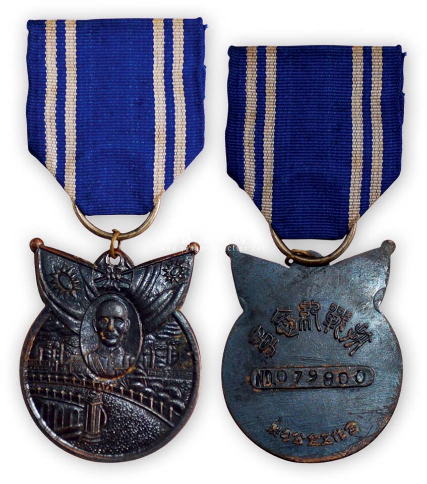 民国“抗战纪念章”1枚,正面有双旗和蒋介石头像等,背有“合作五金公司制”款,保存甚佳,敬请预览