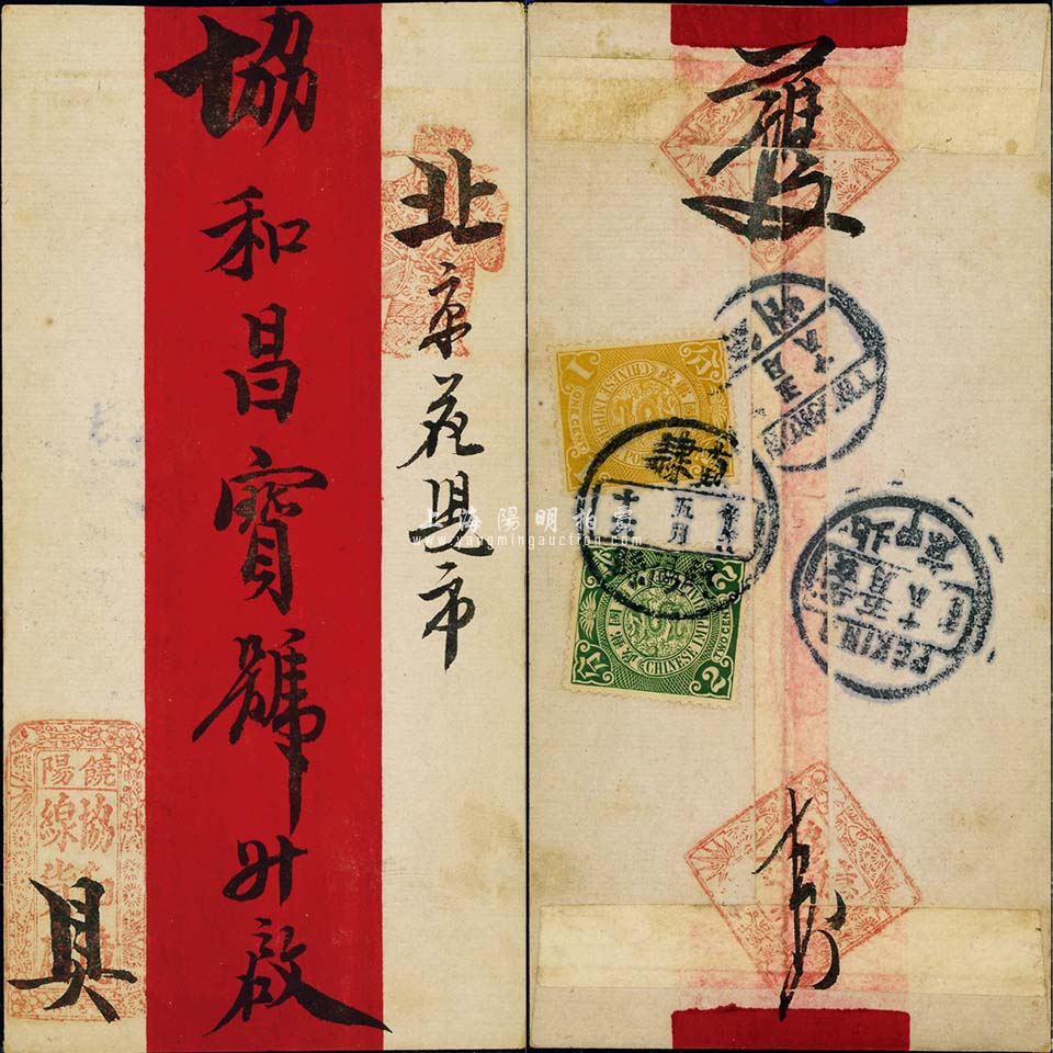 1911年直隶饶阳县寄北京红条封,背贴蟠龙壹分、贰分各1枚,各戳清晰;保存甚佳,敬请预览