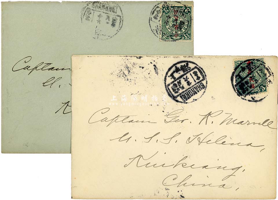 1912年上海寄九江西式封共2个不同,均上贴蟠龙加盖楷字3分,邮戳清楚;保存甚佳,敬请预览