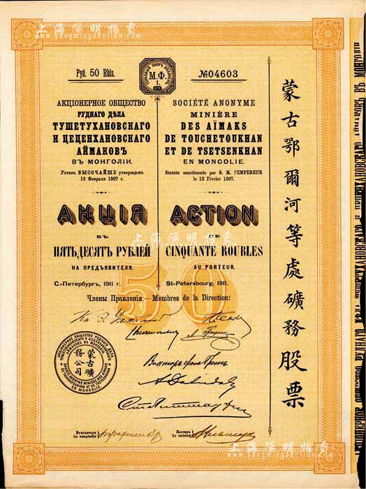 1911年(宣统三年)蒙古鄂尔河等处矿务股票,1股面额50卢布,印刷精致满版水印,法国藏家出品,八五成新