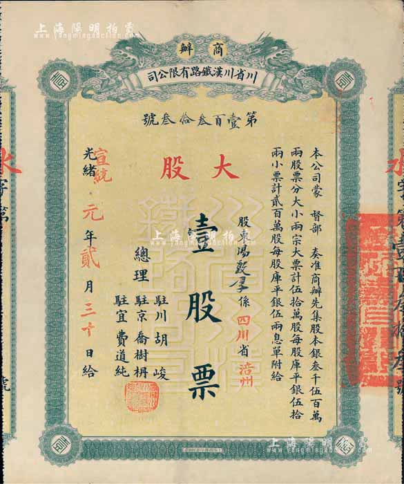 光绪改宣统元年(1909年)商办川省川汉铁路有限公司股票,大股壹股票(每股库平银伍拾两),由四川涪州籍股东汤敦厚氏所承购,背盖“第四次股东会验讫”戳记;此种实用流通票存世颇为稀少,八五成新