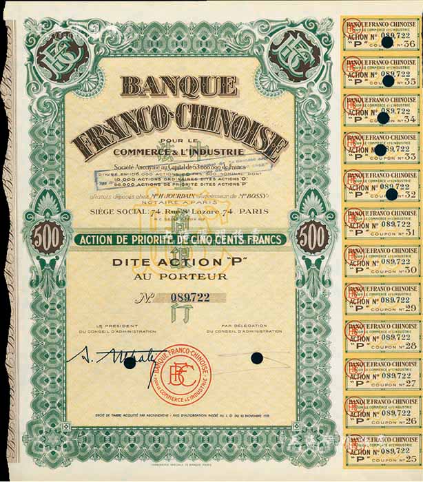1938年中法工商银行股票,1股计500法郎,票上印有中文行名,有水印;该行乃1923年由原中法实业银行改组而成,法国藏家出品,八五成新