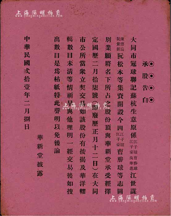 民国贰拾壹年(1932年)大同市·华新堂“承股告白”1张,内为股份转让之公示,发行于广东地区,八成新