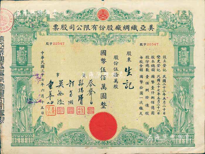 民国三十七年(1948年)美亚织绸厂股份有限公司股票,伍拾万股计国币伍佰万圆,图案美观,票上董事蔡声白(浙江吴兴籍)乃近代著名之民族丝织工业家;七五成新