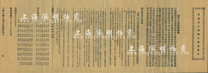 民国十四年(1925年)《倡建李氏模范村招股简章》1份,发行于广东台山地区,上印缘起、招股改组简章16条及创办人、赞成人等详情,颇具内涵;八成新