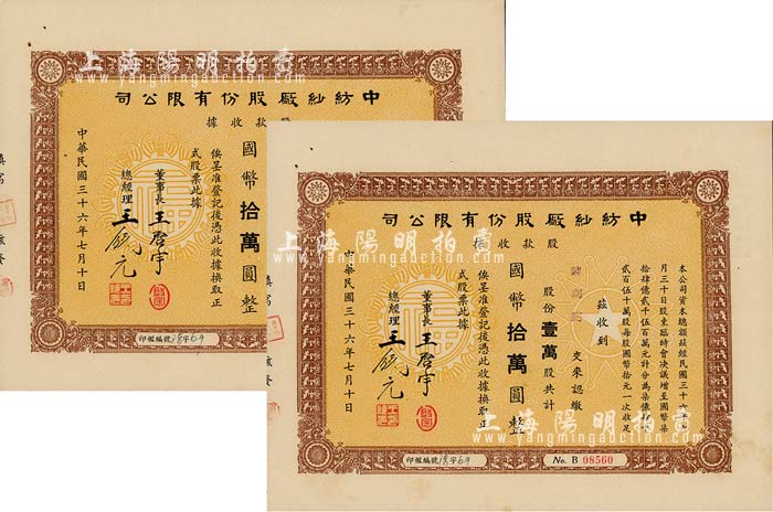 民国三十六年(1947年)中纺纱厂股份有限公司股款收据共2枚连号,面额均为壹万股计国币拾万圆,由同一股东承购,票上董事长王启宇(浙江定海人)为上海纺织业巨子、1950年赴港成立香港纱厂,曾任香港纱厂业同业公会理事长等职;九成新
