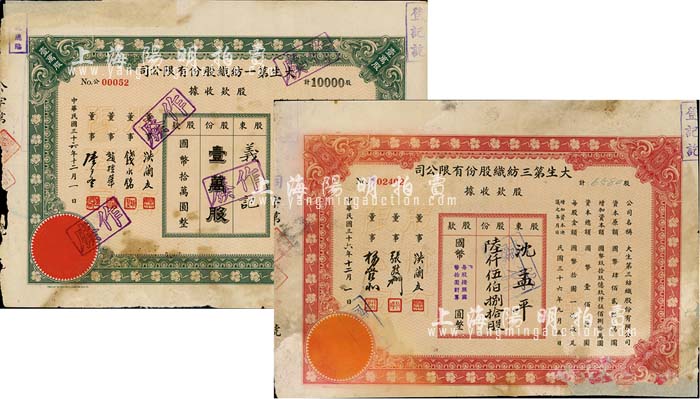 民国三十六年(1947年)大生第一纺织股份有限公司股款收据,绿色壹万股计国币拾万圆;大生第三纺织股份有限公司股款收据,红色陆仟伍佰捌拾股(每股国币拾圆);共计2种不同,背有贴补,六至七成新