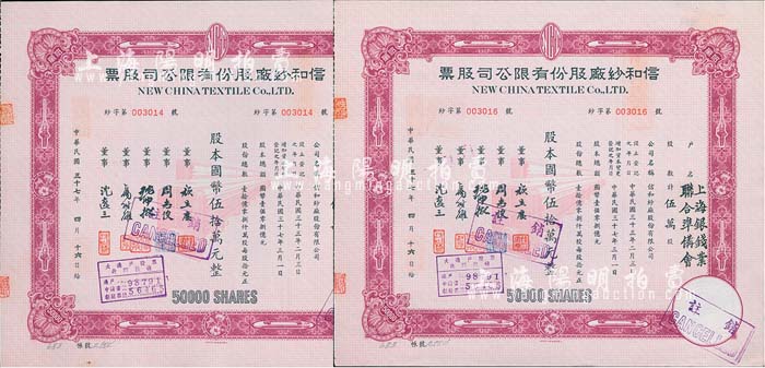 民国三十七年(1948年)信和纱厂股份有限公司股票2枚,面额均为伍万股计国币伍拾万元,票上股东均为“上海银钱业联合准备会”,八五成新