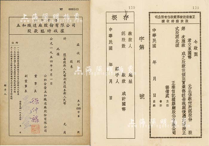 老上海股据2种,详分:民国年·正泰信记橡胶厂股份有限公司股款临时收据,未填用附存根;1954年公私合营五和织造厂股份有限公司股款临时收据,未填用;九成新