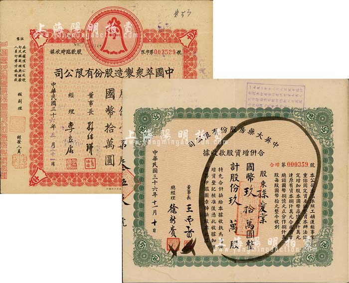 上海老股票2种:详分:1947年中英大药房股份有限公司合併增资股款收据,玖万股计国币玖拾万圆;1947年中国萃众制造股份有限公司股款临时收据,壹万股计国币拾万圆,八成新