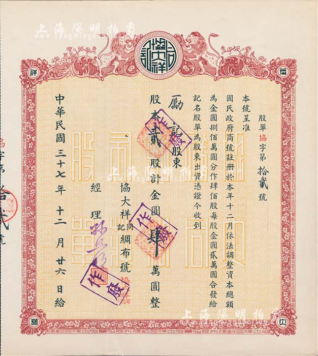 民国三十七年(1948年)协大祥同记绸布号(上海老字号)股票, 贰股计金圆肆万圆,票上号码仅为“协字第12号”,九成新