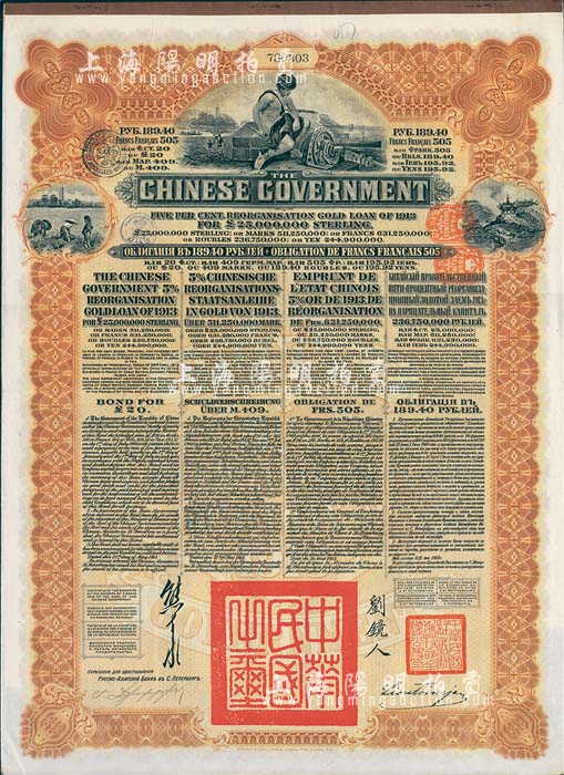 1913年中华民国政府向五国银行团善后大借款公债189.4卢布,由华俄道胜银行代理发行,棕色印刷,由北洋政府总理兼财政总长熊希龄、驻俄公使刘镜人签署,八五成新