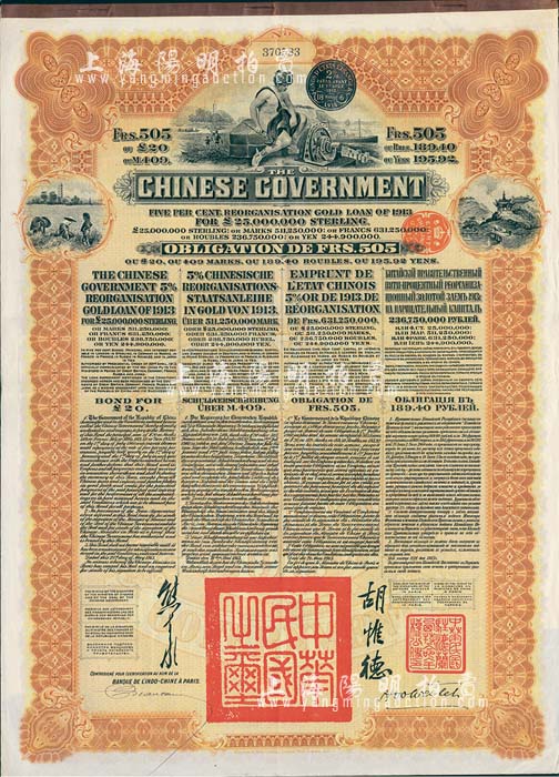1913年中华民国政府向五国银行团善后大借款公债505法郎,由东方汇理银行(Banque de L'Indo-Chine in Paris)代理发行,棕色印刷,由北洋政府总理兼财政总长熊希龄、驻法公使胡惟德签署;八五成新