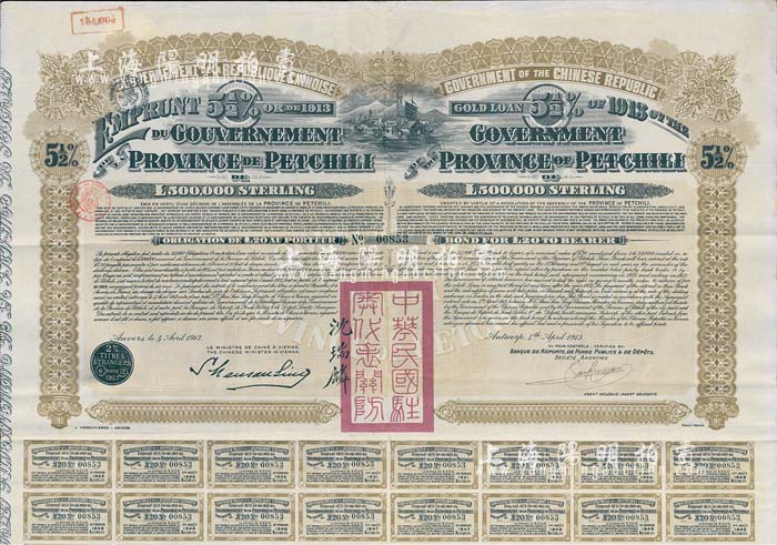 1913年中华民国政府对外发行直隶省金镑债券,面额20英镑,盖有“中华民国驻奥地利关防”和驻奥地利公使沈瑞麟签名,附带有息票,八五成新