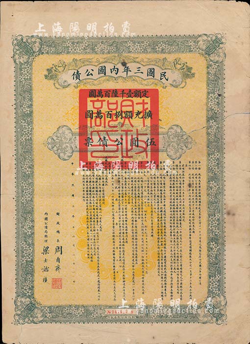 民国三年内国公债伍圆公债票,由财政总长周自齐、内国公债局总理梁士诒签署,少见,有修补,近七成新