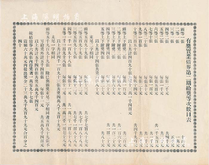 民国早期“有奖实业债券第二期给奖等次数目表”一张,其上列明各奖次、金额等情形,少见,八成新