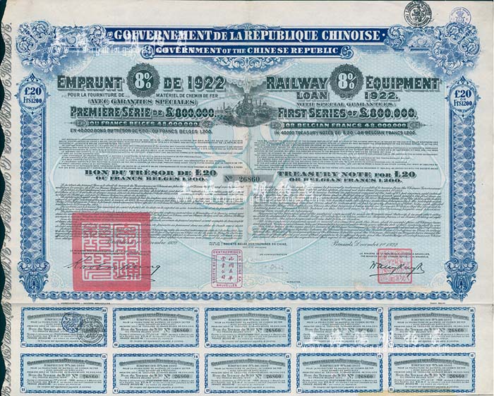1922年中华民国政府对外发行购买(包宁)铁路设备债券20镑=1200比利时法郎,附带有息票,八成新