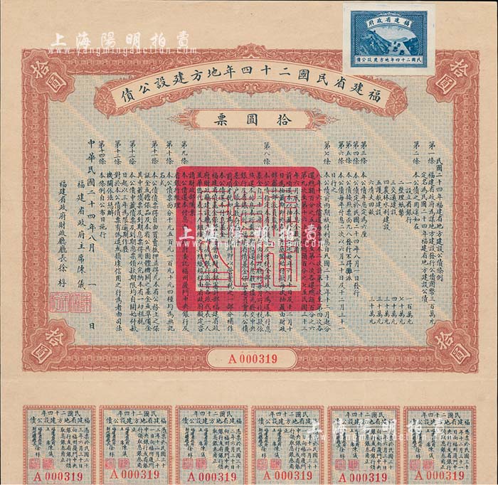 福建省民国二十四年地方建设公债拾圆票,由福建省政府主席陈仪、财政厅长徐桴签署,附带有息票,九成新