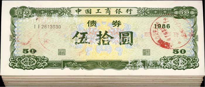 1986年中国工商银行债券伍拾圆共100枚,有水印,近九成新