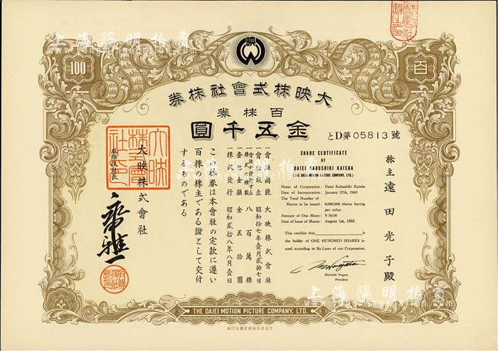 昭和贰拾九年(1954年)大映株式会社株券,百株券金五千圆,日本电影公司老股票,九成新