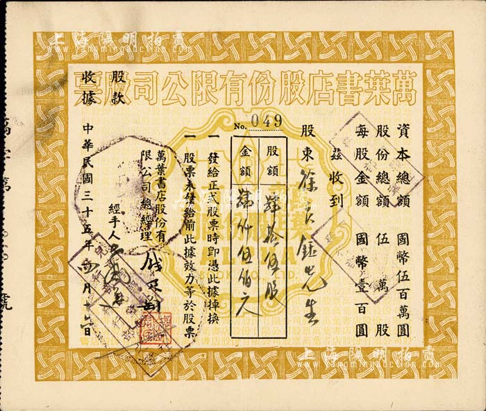 民国三十五年(1946年)万叶书店股份有限公司股票,肆拾伍股计国币肆仟伍佰元;该书店乃当代著名篆刻书画家钱君匋氏所创办,故其股票上均有钱君匋之签名及亲手盖章;少见,八五成新