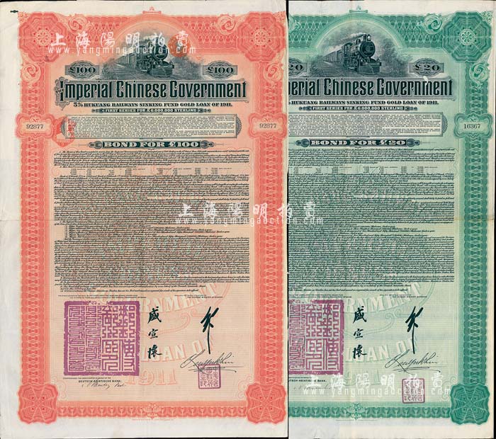 1911年大清帝国政府对外发行湖广铁路债券20英镑、100英镑共2枚全套,由德华银行(Deutsch-Asiatische Bank)代理发行,邮传部尚书盛宣怀签名,八成新