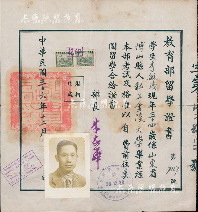 民国三十六年(1947年)教育部留学证书1张,颁给山东博山籍私立金陵大学毕业生李毓茂氏,自费前往美国留学,由部长朱家骅签署,七五成新