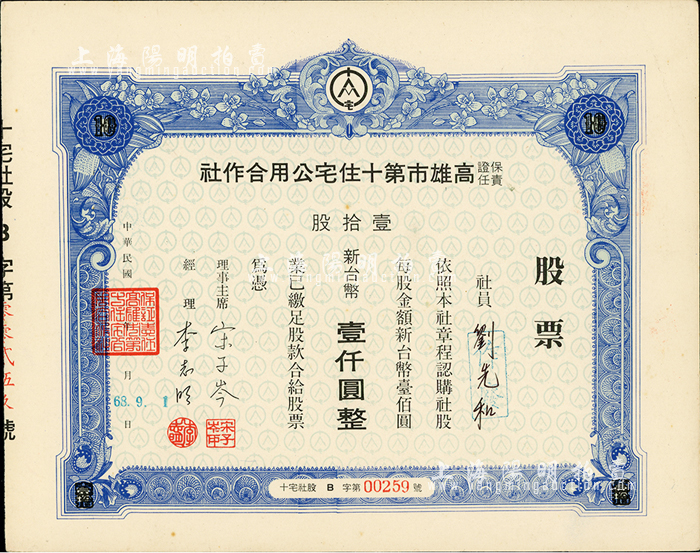 1979年保证责任高雄市第十住宅公用合作社股票,壹拾股计新台币壹仟圆,九成新