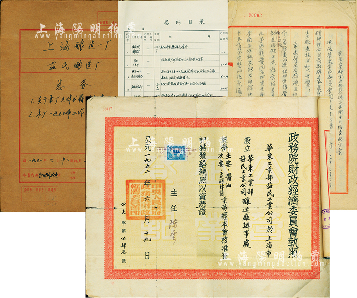 1951至1958年“上海酿造一厂·益民酿造厂”总务卷宗1册,内含:1952年该厂厂长室书籍文件移交清册、华东工业部关于执行厂矿安全卫生大检查的方案、关于上海市立第四人民医院特约机关就医合约、1952年关于承包该厂花园管理工作合约;1951年该厂“上海市人民政府公共房屋管理处临时使用证”及1953、1954年工作总结等等,内容丰富,难以细述;其最大特色是有1张1952年“中央人民政府政务院财政经济委员会执照”,由国家领导人陈云签署;此乃上海滩著名之企业,此卷宗或适合于老股票之实物展览,保存尚佳,敬请预览和