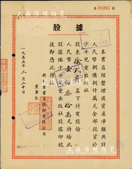 1955年新儿童书店股份有限公司股据,股份人民币壹佰叁拾万元;该书店资产净额共计人民币8.8亿元,全部投资于少年儿童出版社;八成新