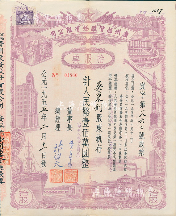 1955年(公私合营)广州投资股份有限公司股票,拾股计人民币壹佰万圆(即新人民币壹佰元),八成新