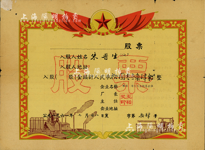 1961年观前商场文具业核算单位股票,股金人民币拾圆零叁角肆分,股票号码为第14号,其形制类同奖状,图案精美;苏州老股票之少见品,七五成新