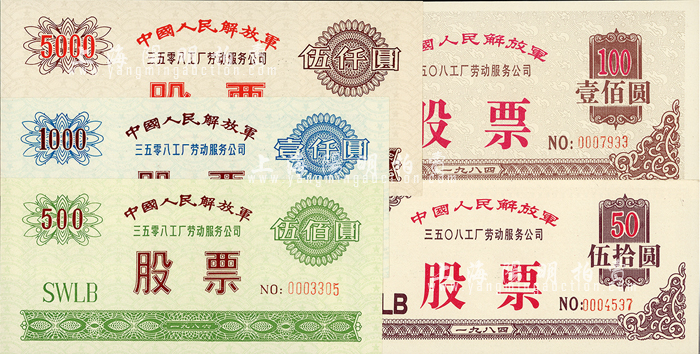 中国人民解放军3508工厂劳动服务公司股票共5枚全套,详分:1984年伍拾圆、壹佰圆,1986年伍佰圆、壹仟圆、伍仟圆;此种军队体系发行的股票,存世颇为少见,全新