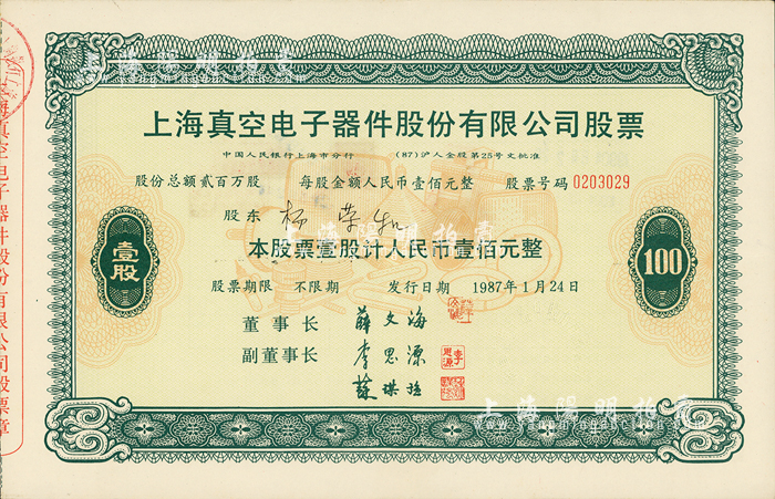 1987年上海真空电子器件股份有限公司股票,壹股计人民币壹佰元,此为改革开放后上海“老八股”之一,八五成新