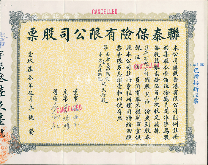 1973年(香港)联泰保险有限公司股票,贰拾份计银伍佰员,米黄色印刷,此乃该公司最后一版股票;香港藏家出品,少见,八五成新