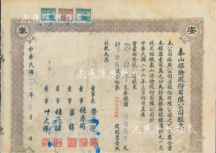民国二十二年(1933年)泰山保险股份有限公司股票,未正式发行品(票上面额系后填),唯可惜注销后下边有缺损,七成新