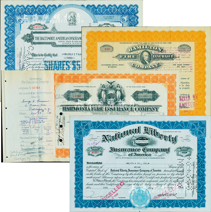 外商保险公司老股票4种,详分:1929年美国巴尔的摩保险公司3股计15美元;1927年汉密尔顿火灾保险公司20股计1000美元;1930年汉莫尼雅火灾保险公司20股计200美元;1938年美国国民自由保险公司10股计20美元;此4家保险公司均在香港和大陆设有分支机构或代理处,美国藏家出品,八成新